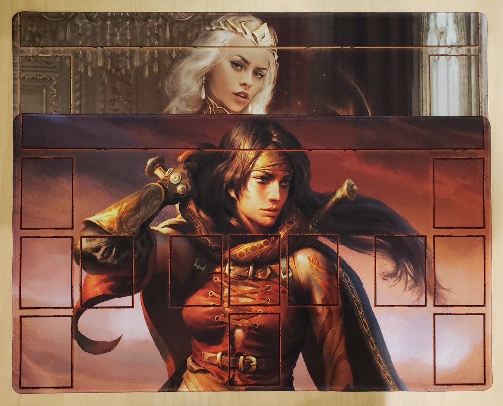 Now, I realize that literally anything can be a collectable if fewer exist than there are people who want them, but the mark ups here seem very aspirational to me, and the volume of different mats hitting the market is ever increasing. In a little over a year of FAB, I can, off the top of my head, think of over two dozen unique ones without even trying hard. You can very easily get a FAB-themed mat printed if you want something clearly attached to the game. LSS hands out their zone templates, high res art assets (for some but not all cards), and is generally blasé about you ordering custom playmats with these assets as long as they’re for personal use and not for profit. I paid $30 apiece to have custom mats printed by Inked Gaming using the Shiyana and Kassai art from LSS’s site.