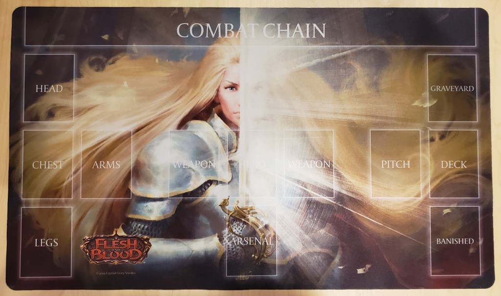I assume everyone knows what a playmat is, but just in case you don’t, a playmat is usually a rubber-backed rectangle of cloth one puts their cards on during play because game store tables are (often correctly) assumed to be absolutely filthy. Playmats have been around for a very long time, but, at least in my experience playing Magic, they didn’t really start to take off until the early 2010s. After that they became fairly ubiquitous in CCG and LCG spaces both as prizes, entry bonuses for events, and plain old retail items. So, it should come as no surprise that Flesh and Blood, much like its contemporaries, has playmats featuring art from various cards.