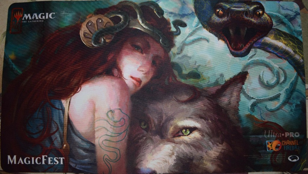 I still enjoy unrolling this Netrunner Day Job playmat regardless of what game I’m playing because it brings me joy as an object. I forget if I got that one at an event or bought it for $20-25 or so (the going rate for Netrunner event mats back in the day). But you also shouldn’t feel constrained to card art, plenty of CCG artists produce art for mats that are distinct pieces not featured on card. While I’m talking about my collection, I’ll throw up a couple other mats I have to give you an idea of prices on stuff that people (or at least I) will/have paid for these things.