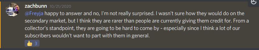 How rare are they? I don’t have exact numbers, but here’s what I do have – I asked Team Covenant’s own Zach Bunn if he was surprised that they were (at that time) already worth $50 on the secondary, and this was his response: