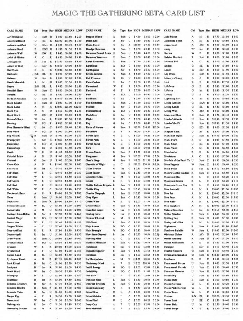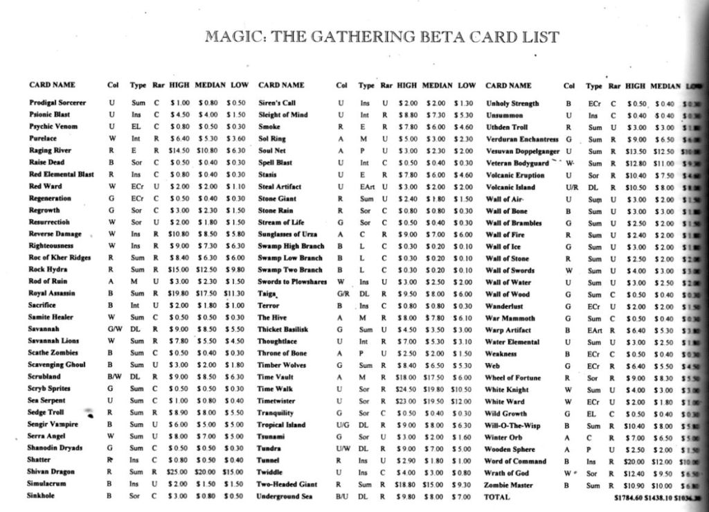 To wrap up the Magic retrospective part of this article, let’s take a quick look at price for these cards in a historical context. We’re about a year into FAB, so we’re going to look at some Magic prices from a roughly similar time period. We’ll take these from a 1994 issue of Scrye, (yes we used to get our prices from magazines; now get off my lawn).