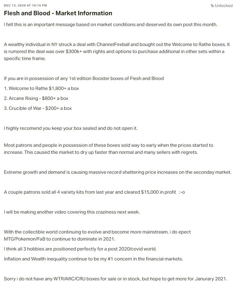 The second event was the ChannelFireball (CFB) partnership announced on October 20th 2020. In this case LSS was partnering with a large retail outlet, but most importantly CFB was going to be creating media content for FAB, something that they only did for Magic and Pokemon to this point. The implications were significant, and an entity of CFB’s reach getting into the FAB market signaled confidence in the product for players and investors. Once again prices rose sharply until we settled into $900 a box for WTR alpha. What was notable about this particular event was that part of the deal, which had been in the works for months, included CFB getting a large quantity of sealed WTR and ARC alpha product that had been reserved for them since early 2020 should the deal go through. For the past month I’ve been saying that CFB has actually been holding these prices down because they haven’t raised prices on their large stock of these boxes. Well, that all changed last night.