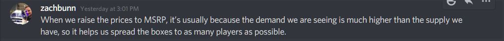 So, there is a good chance more slots will open prior to Monarch. There’s no a guarantee, but it sounds quite promising. Now here’s the thing you’ve got to be aware of. TC subs are, at this stage, a known quantity to a lot of people who are investing in FAB. As noted, I consider them the best place to buy your cards from (assuming you don’t have an actual LGS to support, and even then, I would still get cases from TC as well). So, if those subscriptions open up, you need to be ready to pounce, because a lot of other people are going to be looking to make or establish their position. I know that I personally want to add another 6-8 cases to what I’ve already got locked in. As Zach notes, these are going to vanish shortly after they go up. To have the best shot at getting in, you should be subscribed to the waitlist (at the bottom of the product page I linked in the previous paragraph). You’ll need to be attentive to your email and/or the #wall-street channel of the FAB Discord, where the first person to notice said email will likely announce it right after making their order. You should have a clear idea of how much product you want, have an account already created, and be ready to go. Monarch demand is absurdly high, so don’t sleep on these. The nice little bonus is that, once you have a sub, it will roll over for Kingdoms, so you probably won’t have to do this all over again. Oh yeah, they’re selling at MAP too. So $76 a box. Even if you think I’m wildly overvaluing the promo, and a year out it’s only going to be worth $25, those are still $50 boxes, which, for first edition FAB, is frankly absurd.