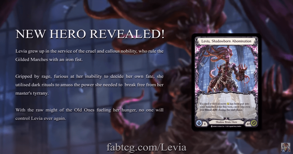 Alright, I’m going to end this piece for real now. I want to say that the focus on cards telling stories without external text doesn’t mean I expect the cards to do all the lifting. As with most CCG’s that attempt to have a story, the cards themselves can only convey so much information (it’s a limit of the medium). What I want is for the cards to tell enough of a story that someone who just opens up packs and never engages with FAB’s fiction beyond that has some sense of what’s happening in the story. But, for anyone who is interested in the narrative, getting a full grasp of what’s going on will obviously require resources outside of the game pieces themselves. And, to that end, there are already extended Monarch narratives on the main site (Levia’s is here – Iain Miki’s art is giving off some Mike Mignola Hellboy vibes that I’m totally here for).