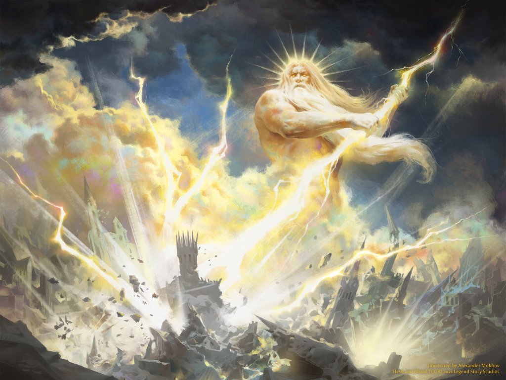 We’ve also got some early hints (and they’re pretty strong hints) that there are powerful god-like forces involved in the conflicts directly. Enlightened Strike was always a card that was unclear to me – like, it’s an absolutely great piece of art, but I didn’t know if it was supposed to be an artistic interpretation or if we were supposed to take it as literally in setting. The former wasn’t out of the question since we had cards like Sloggism and Nibilism which are more impressionistic and suggestive of a mood than a literal depiction of action.