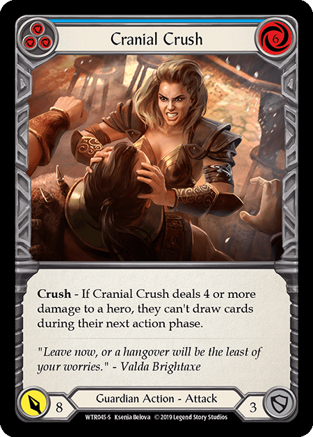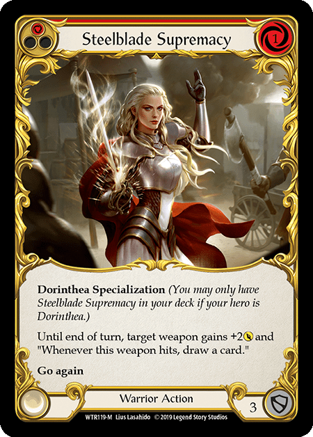 If you remember all the way back to the first article in this series where I talked about Magic, I mentioned how, out of the gate, the cards mainly focused on building a general mood for the world of Dominaria without really developing individual characters or telling stories. I would say that that’s largely where Flesh and Blood started as well, just a basic intro to the world. Hell, the first set is called “Welcome to Rathe”. While we absolutely have characters, and those characters have stories, they aren’t really conveyed through the cards themselves; they mainly live in the lore book and the narrative posts on the LSS homepage. Let’s take a WTR character and look at their cards to see what I mean by that. We’re going to go with Dorinthea because she’s my second favorite warrior (sorry, Thea, I’ve got a weakness for girls with tattoos).