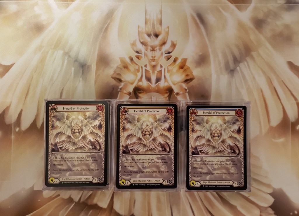 Let’s get straight to business here, LSS sent me a Content Creator Appreciation Kit and I’ve got cards to give out! I’ll talk about my thought process on making a contest to give these out and existence of the kits in general later in this piece, but I want frontload the information on prizes and the contest itself. I took a few days to consider accepting a kit when they offered me one because I didn’t want to do it unless I felt like I had a good idea for how to distribute the promos. As you can tell from the linked post to the LSS site, they are being very permissive in terms of how creators give out prizes, which gave me a lot of room to work with. What’s in my kit? Well, we’ve got extended art foil Herald of Protection in all three pitch values (60 of each). There’s also a Herald of Protection playmat. I’ll be giving out half the cards in this contest via bundles of playsets (so three of each pitch value). I wouldn’t want to leave anyone with only a partially blinged out set. I’ll run a second contest shortly after the first finishes to hand out the others. The playmat is sort of a TBD thing right now. I’ve seen some content creators opt to keep theirs and others have handed them out as prizes (again, LSS is fine with this per the post above). I’m partial to winged beings, but I also have a lot of playmats, so I’m undecided on the subject at the moment. I’ll let you know what’s happening with it in a future post showcasing the winners.