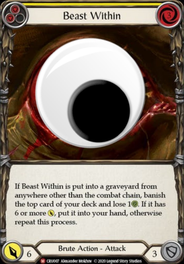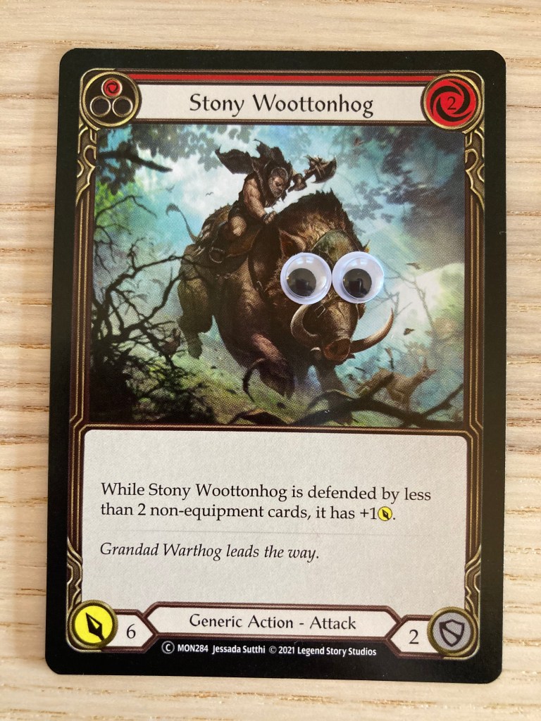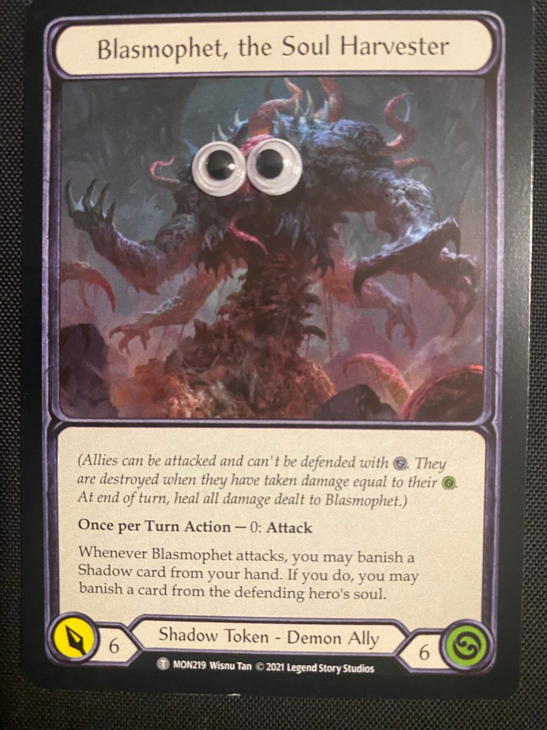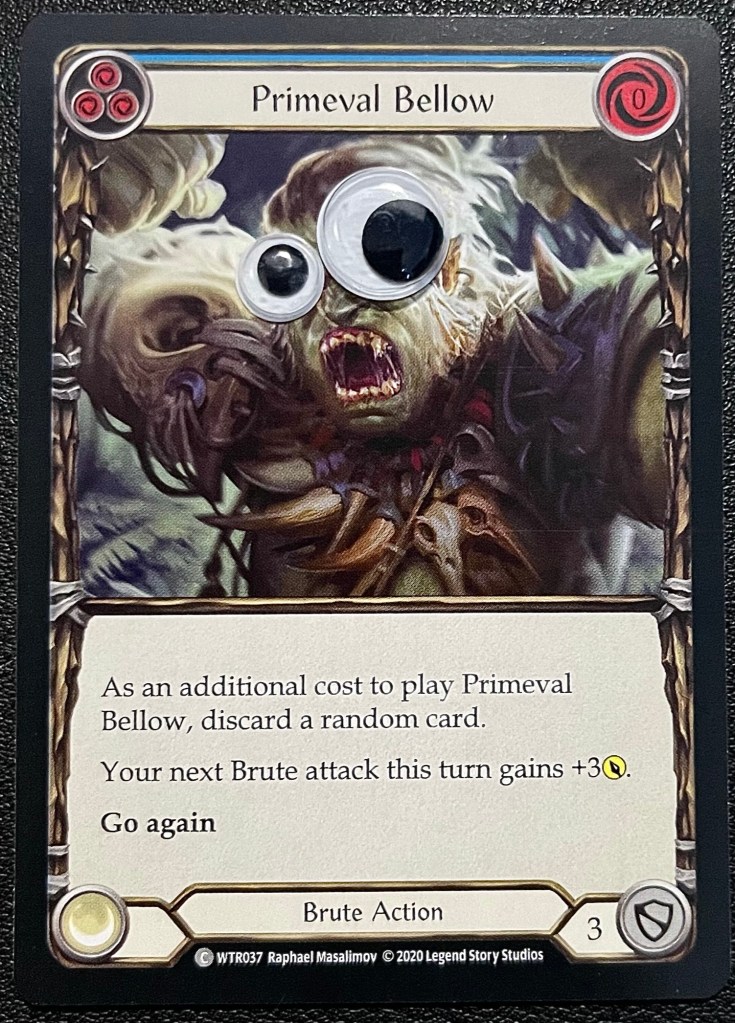 Thanks to everyone who participated in this one. I was actually surprised to see as few entries as I got (39). It goes to show, you really can’t guess what people will respond to. I assumed this would be much easier and more accessible than the flavor text contest, but only got about a third as many entries. Turns out, I’m kind of bad at estimating what will land with people, but I appreciate you coming along for the ride in any case. So back to googly eyes. Once more I enlisted the support of my wife to pick the winners. With fewer prize bundles to give out for this one, it was pretty tight competition. It’s worth mentioning at the outset that I opted to eliminate entries where multiple people did the same card unless one had a really interesting take on it – I got a bunch of Bone Head Barrier submissions which were very similar, for instance. Let’s hop right into these in no particular order.