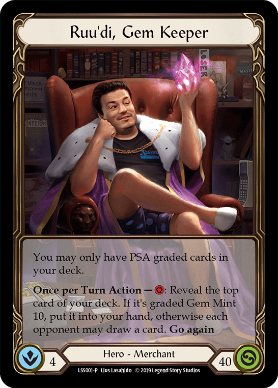 For anyone who isn’t already aware, Rudy of Alpha Investments sold some of his patrons a special Rudy promo along with art cards of the first four Fable gems (this also served as a teaser for the next one to be released). There was a limited print run of these cards, and Rudy vowed to destroy any unsold copies after keeping ten for himself (the cards have since been lightly charred in a somewhat anticlimactic video). The sale itself was fairly controversial given the high asking price. Those who planned to buy one generally arguing that, in the future, it would go be worth well over what they were paying now. Many of those who weren’t buying the card were pretty derisive about it, often arguing that it was a bad thing to purchase and/or the optics of a $1000 promo being sold directly created a bad look for LSS. I find that second point to be pretty dubious. The only people who were really aware of the Rudy promo were already hyper keyed into FAB and I doubt that many or even any of them quit the game because LSS sold Rudy some unplayble promos two years ago when Alpha boxes were $65. Meanwhile, prospective players who aren’t already focused on FAB news likely heard nothing about this whole affair. If LSS had sold the card directly to players for $1,000, that would have been an entirely different story, but they didn’t, so it’s not. As a sort of footnote to the whole saga, a few weeks after the sale ended, Rudy cheekily announced that people who had ordered a bundle would get $69 off his future FAB sales as a perk.
